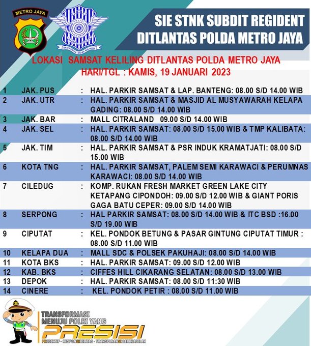 PajakOnline.com—Polda Metro Jaya menyediakan 14 lokasi layanan Samsat Keliling bagi warga DKI Jakarta dan sekitarnya untuk membayar pajak kendaraan bermotor (PKB), pada hari ini Kamis(19/1/2023).