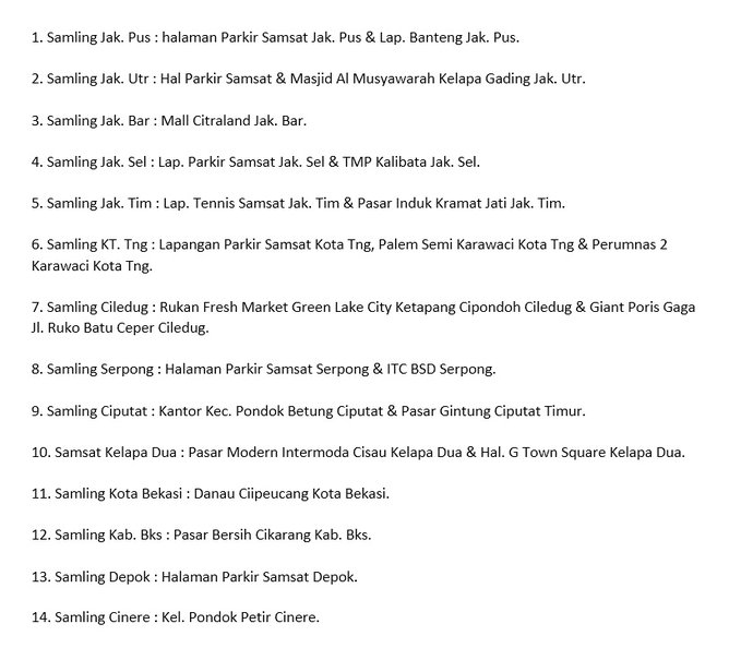 Berdasarkan informasi yang kami peroleh dari akun resmi twitter Traffic Management Center @TMCPoldaMetro, Layanan Satuan Administrasi Manunggal Satu Atap (Samsat) Keliling berlangsung mulai pukul 08.00 hingga selesai.